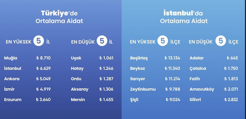 Listenin sonunda ise 1061 TL ile Uşak, 1246 TL ile Hatay, 1287 TL ile Ordu, 1306 TL ile Aksaray ve 1455 TL ile Mersin yer aldı. Megakentte 13 bin 134 TL ile en yüksek aidat ortalaması Beşiktaş’ta gerçekleşti.